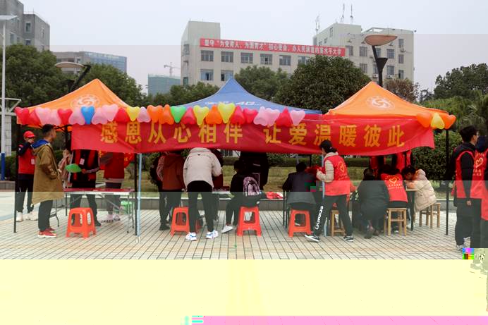為迎合感恩節活動中感恩主題,以實際行動呼籲同學們常懷感恩,将愛大膽說出來,從而改善校園内同學關系、師生關系,促使校園内和諧溫馨良好風氣的形成,并由小及大,讓日漸冰冷的社會增添一抹溫暖。11月30日,2003网站太阳集团聯合計算機學院、語言文學學院和機械工程學院青年志願隊到校園内開展主題為“感恩從心開始,讓愛溫暖彼此”的活動,并于南華廣場設置線下擺點。